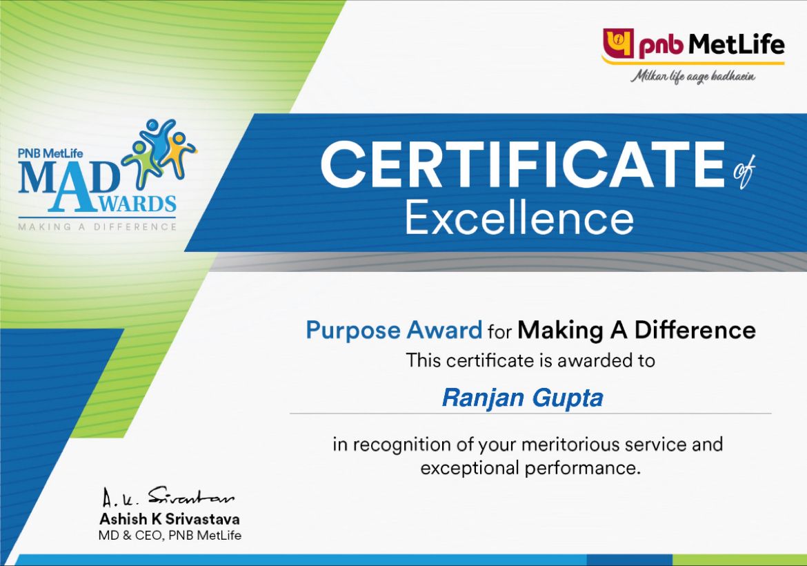 Honored with the prestigious Make a Difference award by the CEO of PNB MetLife for exceptional contributions that significantly impacted business performance and team outcomes. This recognition stands as a testament to leadership, dedication, and the ability to drive meaningful change.